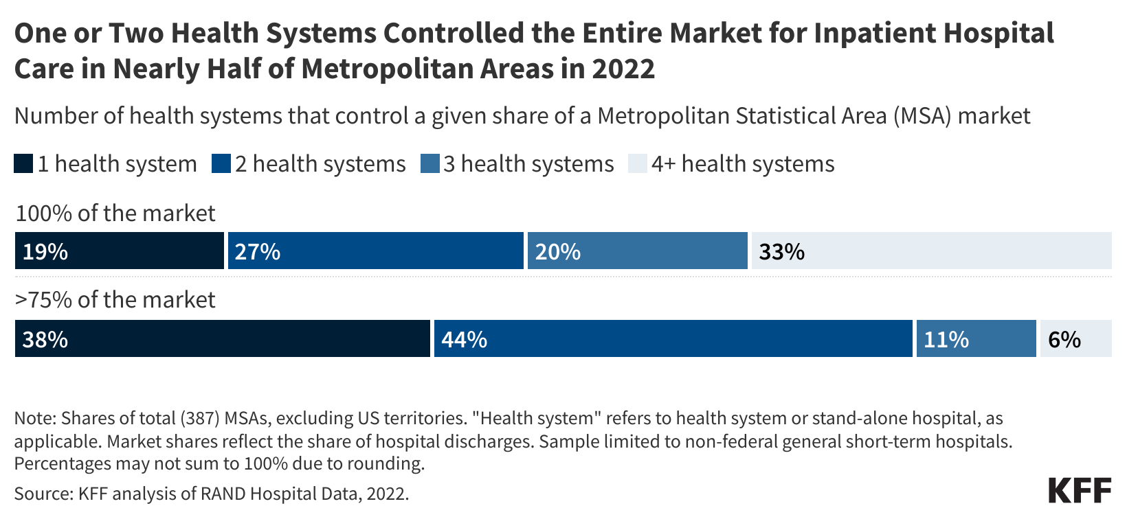 Nearly half (47%) of metropolitan areas across the country had only one or two hospitals or health systems providing general inpatient hospital care in 2022, a new KFF analysis finds.