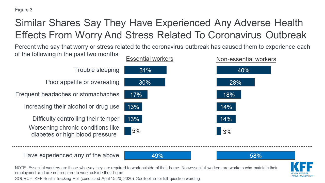 Despite being more likely to report financial challenges and knowing someone who has died from the virus, essential workers are no more likely than non-essential workers to report any adverse effects on their mental health and well-being due to the pandemic. About half of essential workers (49%) and a statistically similar share of non-essential workers (58%) say the coronavirus outbreak has caused them to experience at least one negative effect, including trouble sleeping, appetite problems, increased alcohol or drug use, or worsening chronic health problems.
