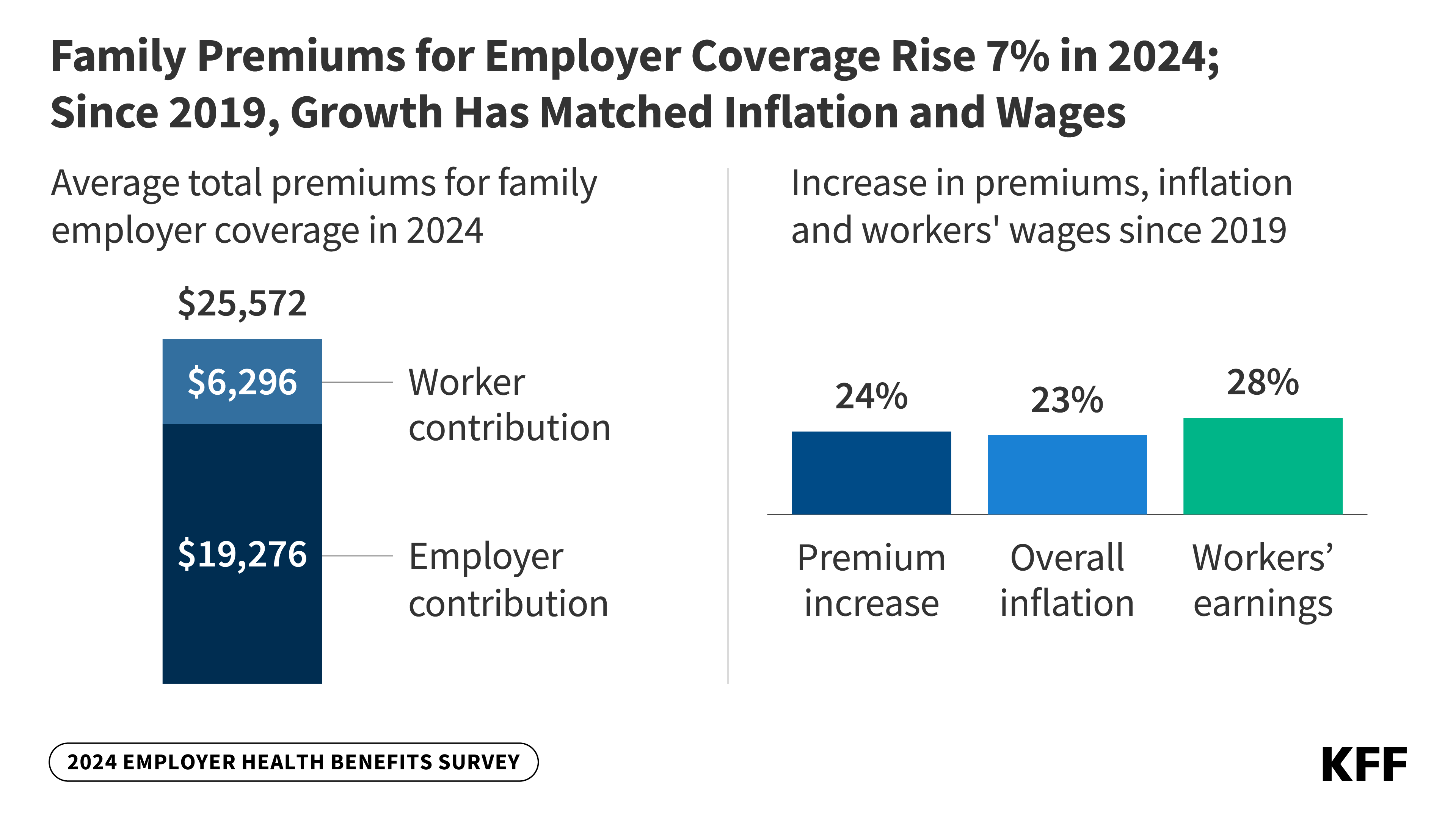 Family premiums for employer-sponsored health insurance rose 7% this year to reach an average of $25,572 annually, KFF’s 2024 benchmark Employer Health Survey finds. On average, workers contribute $6,296 annually to the cost of family coverage.