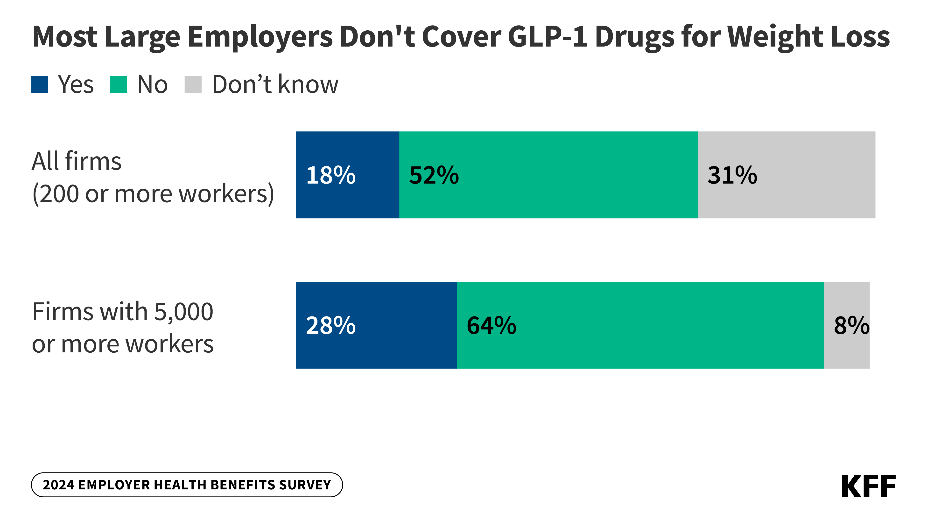 Fewer than 1-in-5 large employers with at least 200 workers offering health benefits (18%) say that they cover GLP-1 drugs for weight loss, while half (52%) say they don’t cover them, and the others (31%) are unsure. Among the largest firms with at least 5,000 workers, more than a quarter (28%) say they cover GLP-1 drugs, and nearly two thirds (64%) say they don’t.