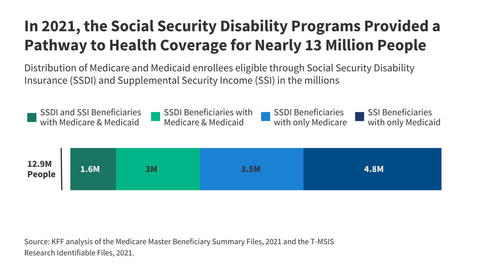 Medicare provides health insurance coverage to 66 million people. It covers a comprehensive set of health care services, including hospitalizations, physician visits, and prescription drugs, along with post-acute care, skilled nursing facility care, home health care, hospice, and preventive services.Social Security Disability Benefits and Health Coverage