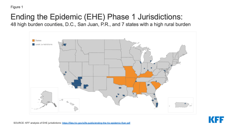 The “Ending the HIV Epidemic Initiative: A Plan for America”, is a federal effort to reduce new HIV infections in the United States by 75% in five years and 90% in ten years. It was launched by the Trump Administration in 2019, building on efforts made by the Obama Administration and is continuing under the Biden Administration. During Phase 1, the initiative is focusing on the 48 counties in the U.S. with the highest HIV diagnoses, as well as San Juan, Puerto Rico, Washington D.C., and 7 states with a substantial share of rural HIV cases (see Figure 1). The commitment to “ending the HIV epidemic” has been accompanied by additional federal funding, including reprogrammed FY 2019 funding and new Congressional appropriations in FY 2020, FY 2021, and FY 2022. Still, this additional funding accounts for a relatively small share of overall federal HIV funding provided to state and local jurisdictions.