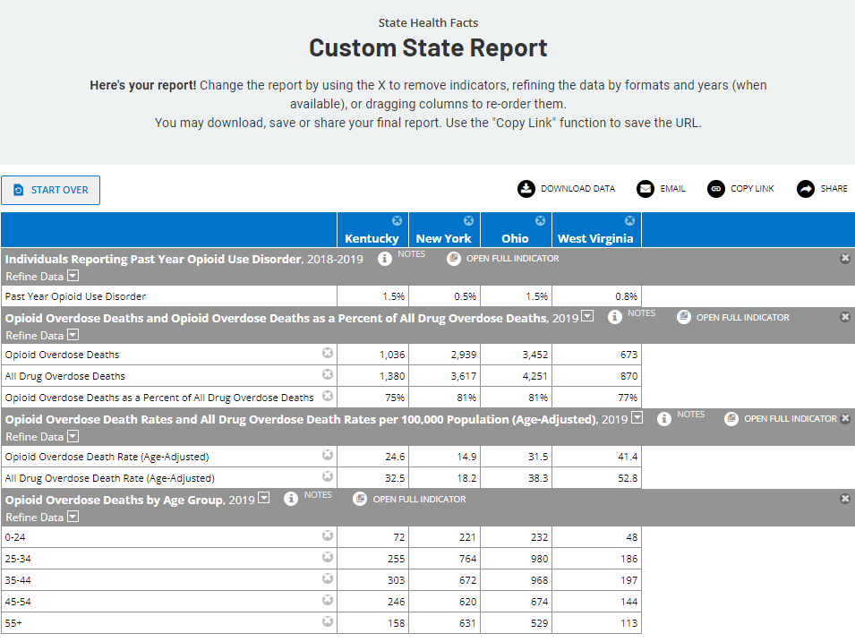 Create a custom report compiling data across health topics for a single state or multiple states.