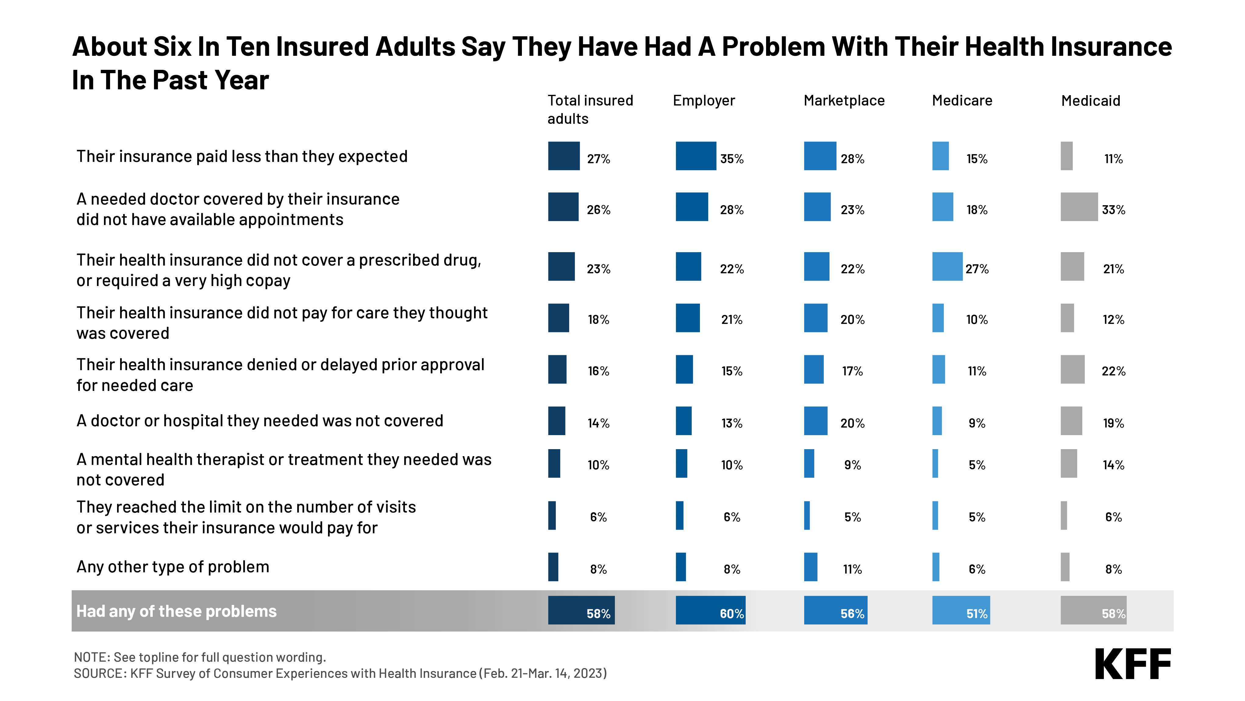 Nobody wakes up in the morning thinking warm and fuzzy thoughts about health insurance companies, and some people have had horrible experiences. The online reaction that followed Thompson’s assassination may at times have been macabre, but it was also reflective of real problems people have experienced with their health coverage and conveyed the real anguish those who are sick and cannot get the care they need can experience. More than half of insured Americans (58%), and even more people who are in ill health (67%), report problems with their coverage. This chart shows the problems people report from our big survey of consumer experiences. It’s not one thing; it’s “death by a thousand cuts” in a health system in which complexity is a feature, not a bug.