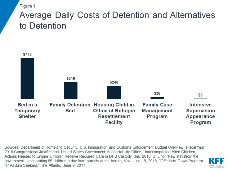 Detaining families and children is more expensive than alternative community-based supervision and monitoring programs (Figure 1). According to the 2018 budget request for U.S. Immigration and Customs Enforcement (ICE), the average daily rate for a family bed in a detention center is $319.17 Costs for housing a child separately in an ORR-funded facility were $248 on average per day in 2014.18 However, daily costs for recently constructed temporary or tent-based shelters are estimated to be substantially higher, at $775 per person per night.19 The cost of monitoring individuals in the community through alternatives to detention is much lower. Specifically, the 2018 ICE budget request notes that the daily cost of community supervision and monitoring is $4.50.20 The average daily cost was $36 for the Family Case Management Program, a community-based program for families seeking asylum, which the Trump Administration ended in 2017. 21