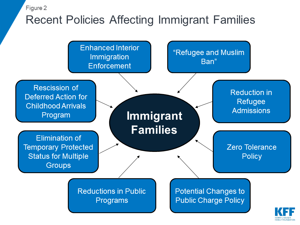 The zero tolerance policy at the border adds to a range of other recent policies negatively affecting the health and well-being of immigrant families, including families with U.S. born citizen children already residing in the U.S. Since President Trump has taken office, he has implemented a number of policies to enhance immigration enforcement and restrict legal immigration (Figure 2). Focus groups conducted in Fall 2017 found that these policies, along with rising anti-immigrant sentiment, are leading to resounding levels of fear and uncertainty among immigrant families, including those with lawful status. Further, this fear and uncertainty are having significant negative effects on the health and well-being of children in immigrant families already present in the U.S., who are largely U.S.-born citizens.