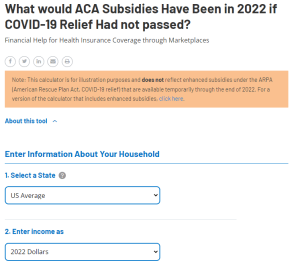 Related: See how 2022 premium payments would increase without the ARPA COVID-19 relief law’s enhanced tax credits. Click the images below to access two versions of the calculator.