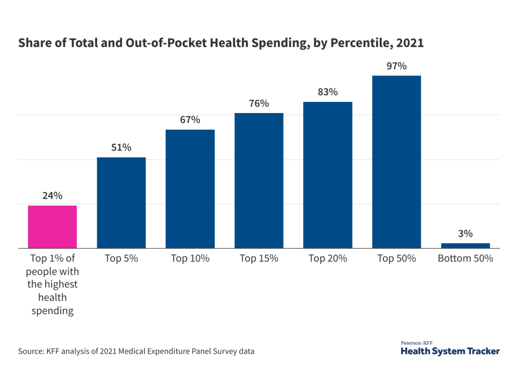 But first, it’s important to know that at any given time, most people are relatively healthy. The 5% of the population with the highest health costs makes up about half of total health spending. Removing the people with the highest health costs could significantly decrease premiums (before subsidies) for the healthier group, while significantly increasing premiums for sicker people.