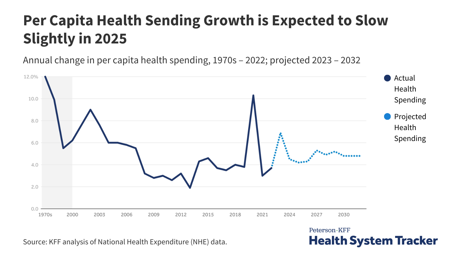 In 2024, per capita health spending growth is estimated to have slowed to 4.5%. Growth is expected to slow further in 2025 and 2026 to 4.2% and 4.3%, respectively. - Health and Wellbeing