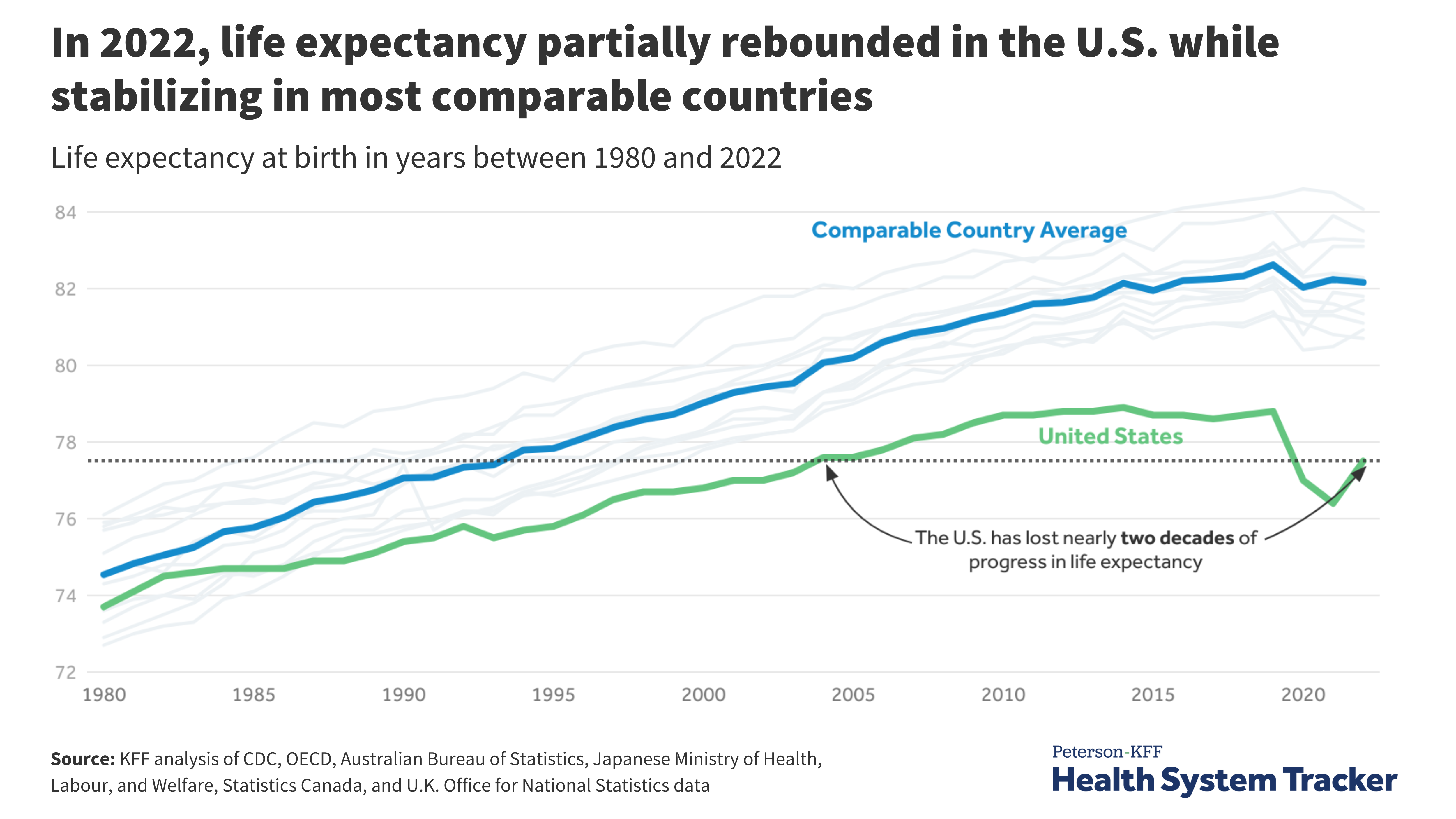 Life expectancy in the U.S. decreased by 1.3 years from 2019 before the COVID-19 pandemic to 2022, whereas in peer countries life expectancies fell by an average of 0.5 years in this period. While life expectancy in the U.S. increased by 1.1 years from 2021 to 2022, U.S. life expectancy continues to lag behind life expectancy in comparable countries.