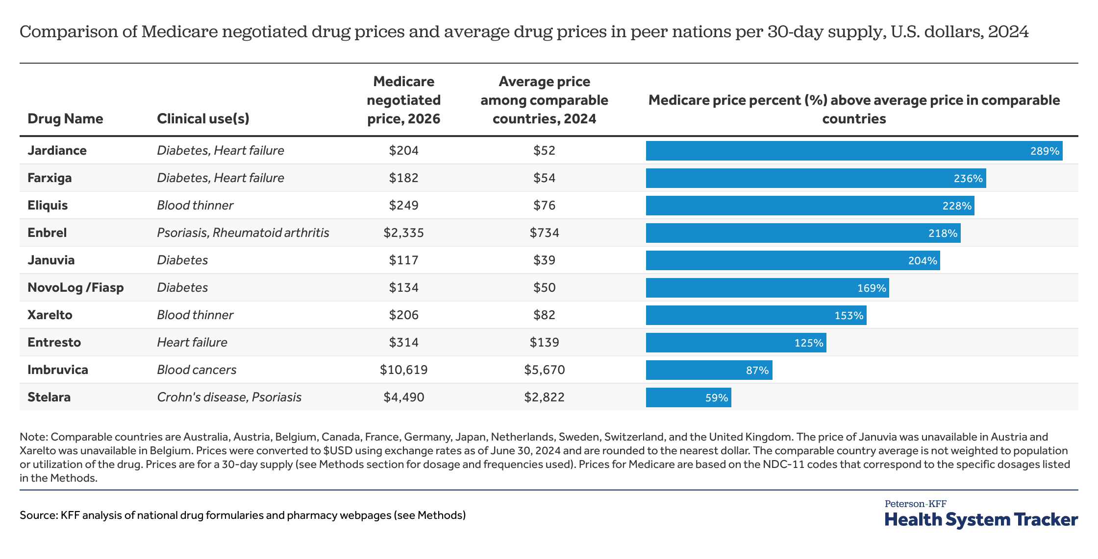 This analysis finds that Medicare’s negotiated prices for 10 high-expenditure prescription drugs are lower than what private Medicare drug plans had been paying, but still much higher than the prices available in 11 other wealthy nations.. It is available on the Peterson-KFF Health System Tracker.