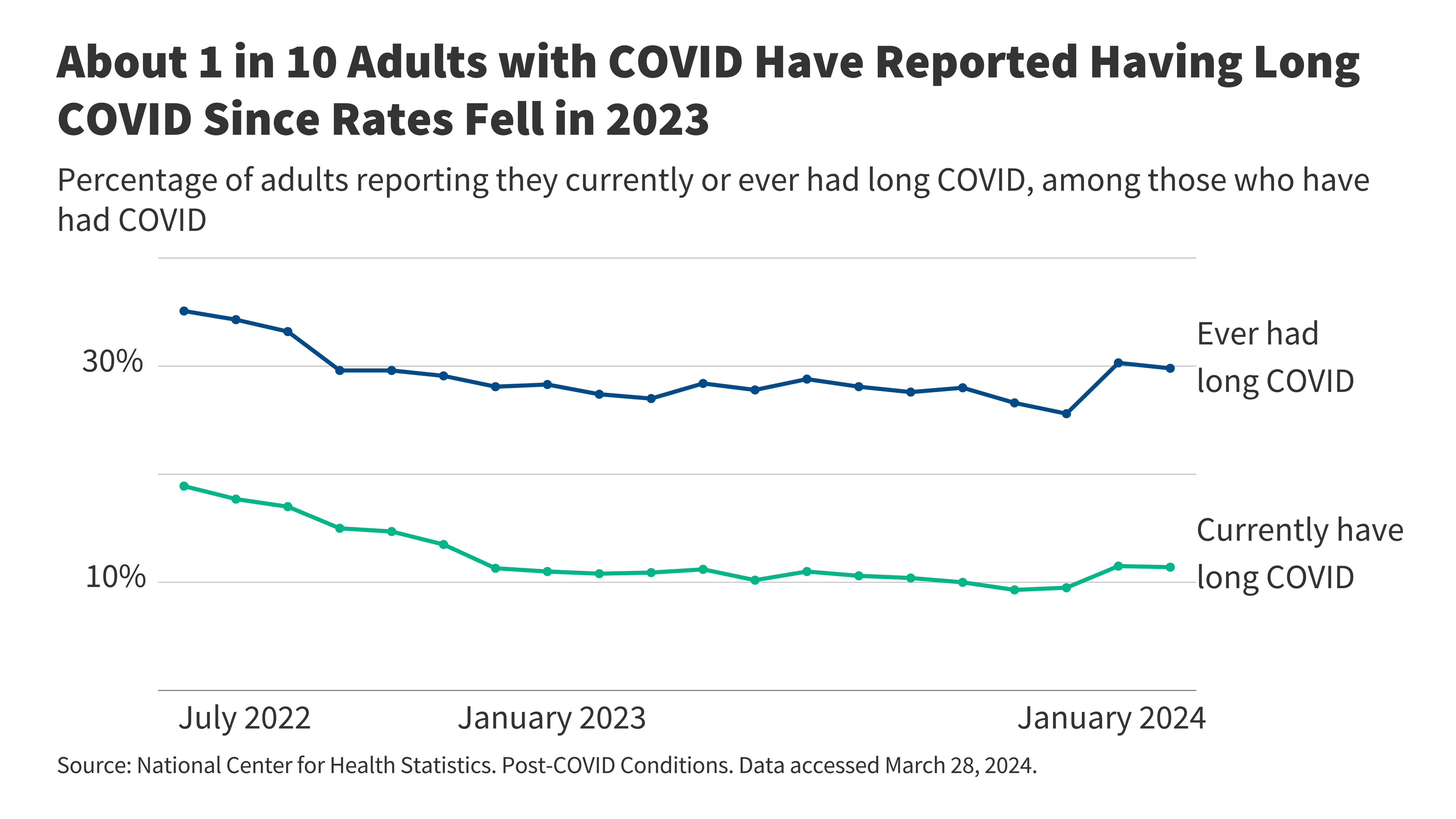 Rates of long COVID have begun to flatten. About 1 in 10 adults with COVID have reported having long COVID since rates fell in 2023, according to a KFF analysis of the latest data from the Centers for Disease Control and Prevention. If the rate continues to hold steady, new forms of prevention or treatment may be important to achieve future reductions in long COVID.