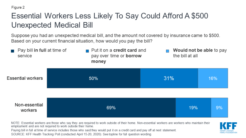 Essential workers working outside their homes may have an elevated risk of contracting coronavirus, and by extension, an increased risk of incurring expenses related to coronavirus treatment. Yet this group is less likely to have the financial resources to pay an unexpected medical bill without going into debt. When asked how they would pay for an unexpected $500 medical bill, a larger share of essential workers say they would have to borrow money to pay back the bill (31% compared to 19% of currently employed non-essential workers) or say they would not be able to pay the bill at all (16% vs 9%).