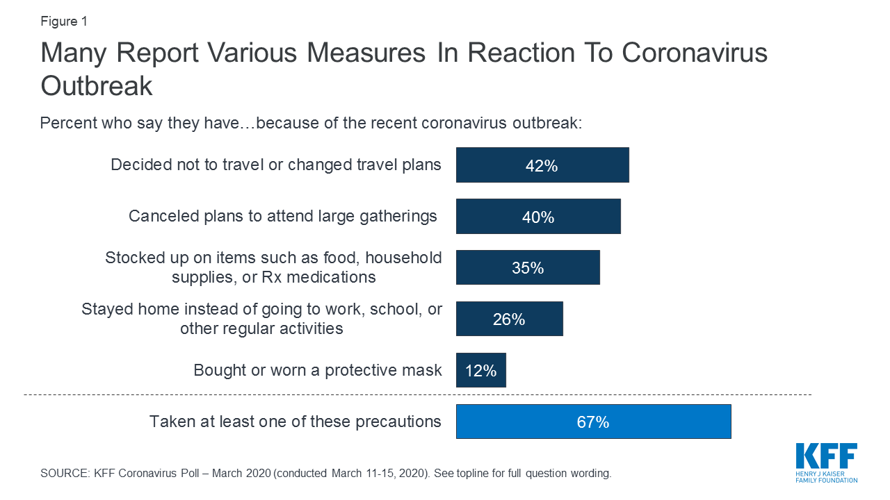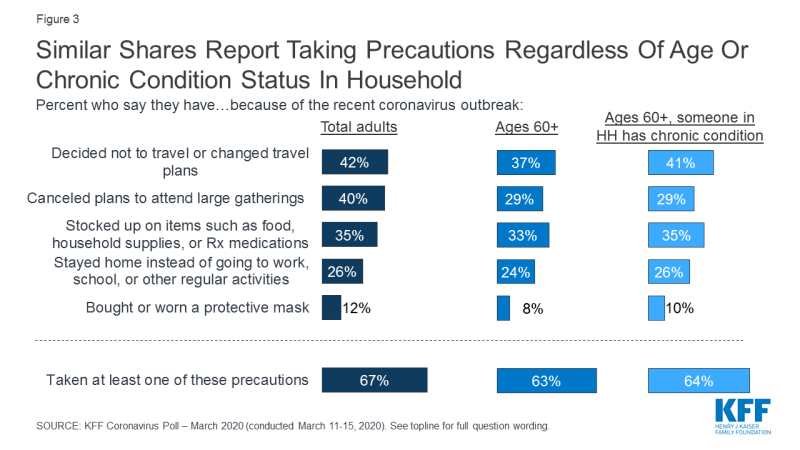 - The survey was in the field as social distancing measures were being put in place across the country, and many adults report taking measures like changing or canceling travel (42%), canceling plans to attend large gatherings (40%), stocking up on food, supplies and medications (35%), staying home instead of going to work or other regular activities (26%), and buying or wearing a protective mask (12%). Although older adults and those with serious health conditions are at greater risk from serious complications if infected with coronavirus, these groups are not more likely than the general public to report taking these types of precautions.