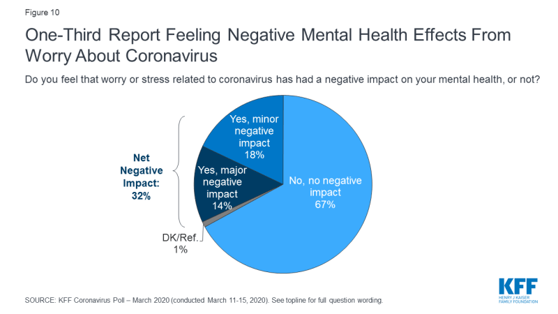 These worries are taking a toll for some. About a third of adults overall (32%) feel that worry and stress related to coronavirus has had a negative impact on their mental health, including 14% who say it has had a “major” impact.