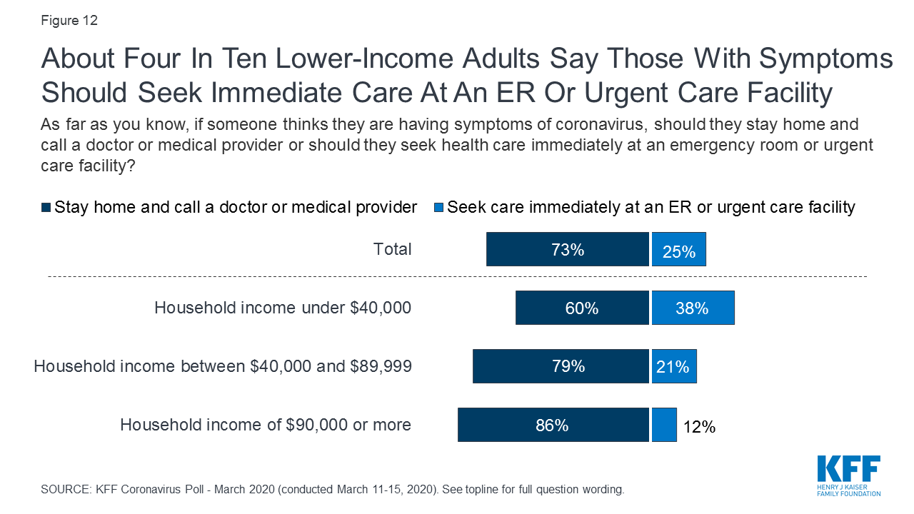 Figure 12: About Four In Ten Lower-Income Adults Say Those With Symptoms Should Seek Immediate Care At An ER Or Urgent Care Facility