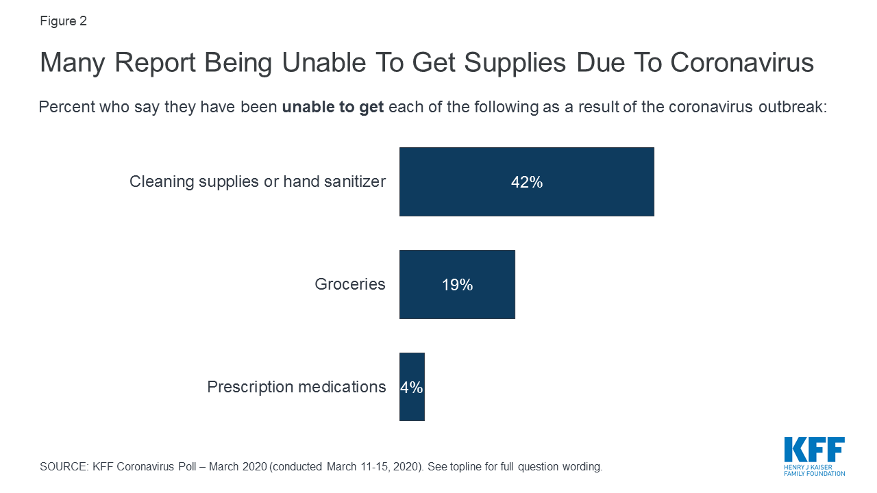 Some people report being unable to get different types of supplies as a result of the outbreak, including about four in ten (42%) who say they were unable to get cleaning supplies or hand sanitizer, 19% who were unable to get groceries (rising to 30% among those who took the survey between March 13-15), and 4% who were unable to get prescription medications.