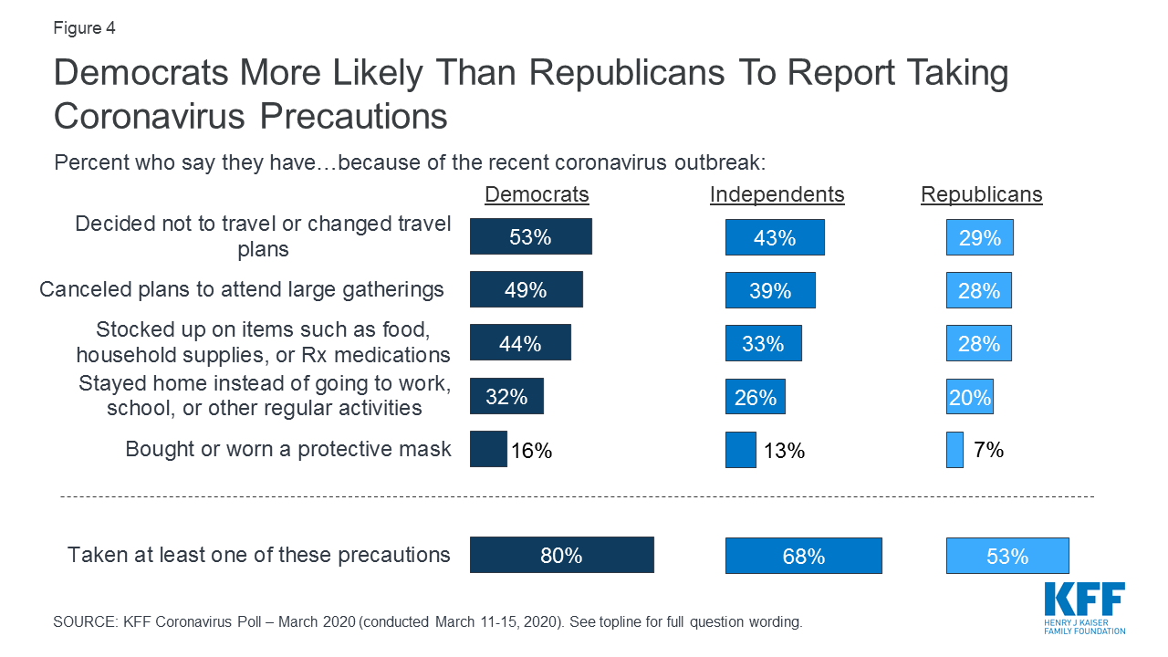 Instead, there is a large partisan difference in the share who report taking precautions, with Democrats more likely than Republicans to say they changed travel plans (53% vs. 29%) or canceled plans to attend large gatherings (49% vs. 28%). Overall, eight in ten Democrats and about half of Republicans (53%) report taking at least one of these precautions.