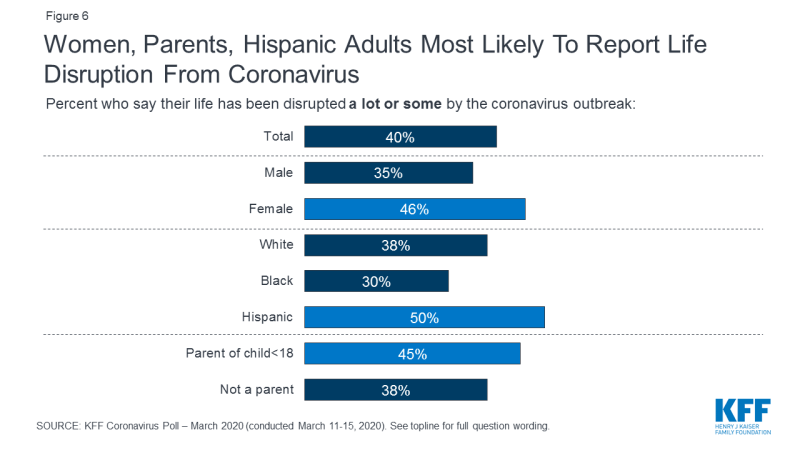 Overall, 40% of the public says their life has been disrupted at least “some” by the coronavirus outbreak, including 16% who say it has been disrupted “a lot.” Among those answering the survey between March 13-15, half (50%) say their life was disrupted, including 22% who said it was disrupted “a lot.” Those most likely to say their life was disrupted include Hispanics (50%), women (46%), and parents of children under age 18 (45%).