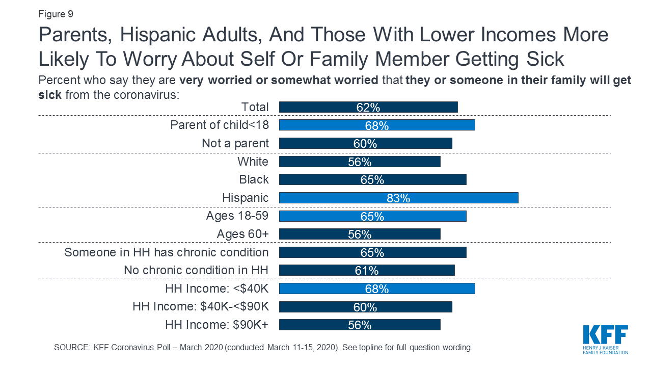 Figure 9: Parents, Hispanic Adults, And Those With Lower Incomes More Likely To Worry About Family Member Getting Sick