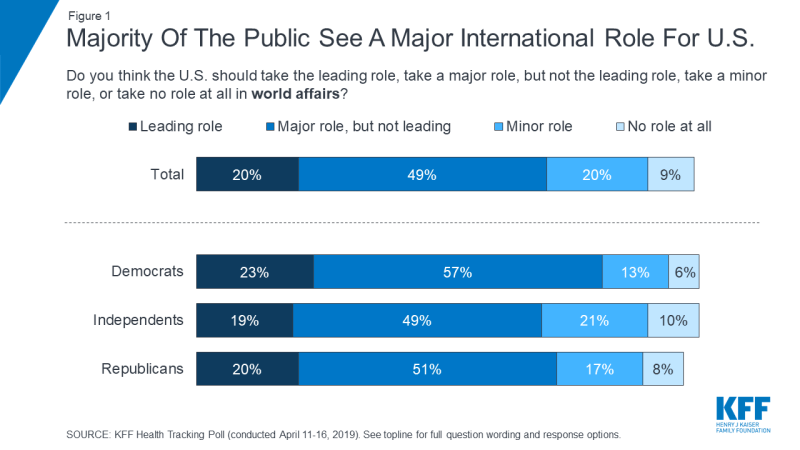 Consistent with previous KFF polling our latest poll finds broad support (68 percent) for the U.S. playing at least a major role in world affairs (Figure 1), and six in ten (58 percent) believing the U.S. should play a “leading role” or “major role” in improving health for people in developing countries (Figure 2). In the latter case, larger shares of Democrats (70 percent) say they want the U.S. to take at least a major role compared to Republicans (37 percent) or independents (55 percent).