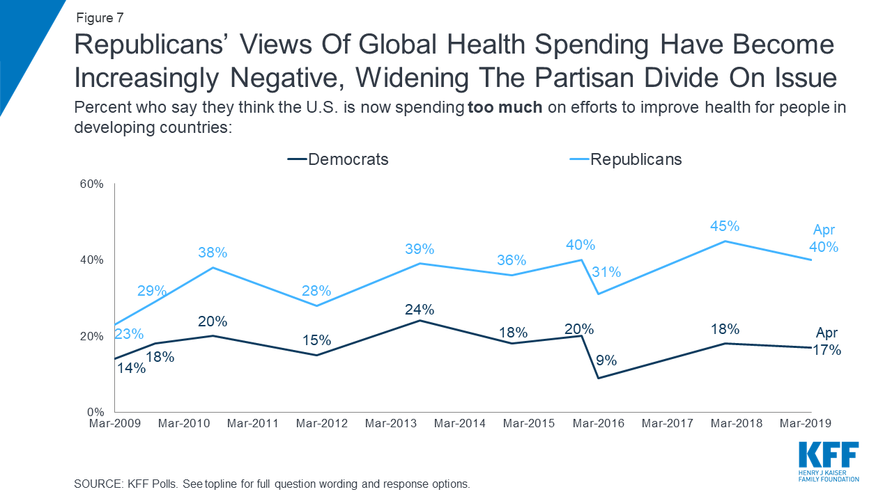 At the same time, there has been an increasing partisan divide regarding views of U.S. spending on global health. In 2009, one-fourth (23 percent) of Republicans and one in seven (14 percent) Democrats said they felt the U.S. was spending “too much” on efforts to improve health for people in developing countries. Ten years later, the share of Republicans who express this view grew 17 percentage points (up to 40 percent) while among Democrats, the share is still about one in seven (17 percent) (Figure 7).