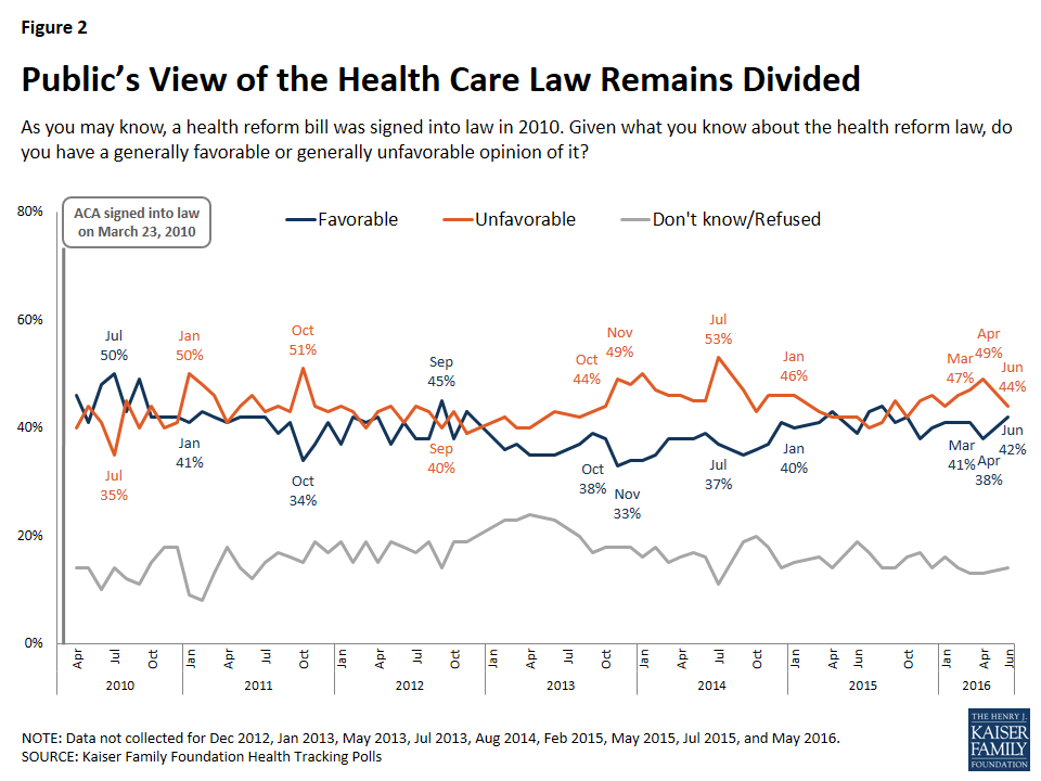 - Current attitudes about the ACA are divided, with 44 percent expressing an unfavorable opinion and 42 percent reporting a favorable opinion; 16 percent of Democrats report an unfavorable opinion, down from 25 percent in April.