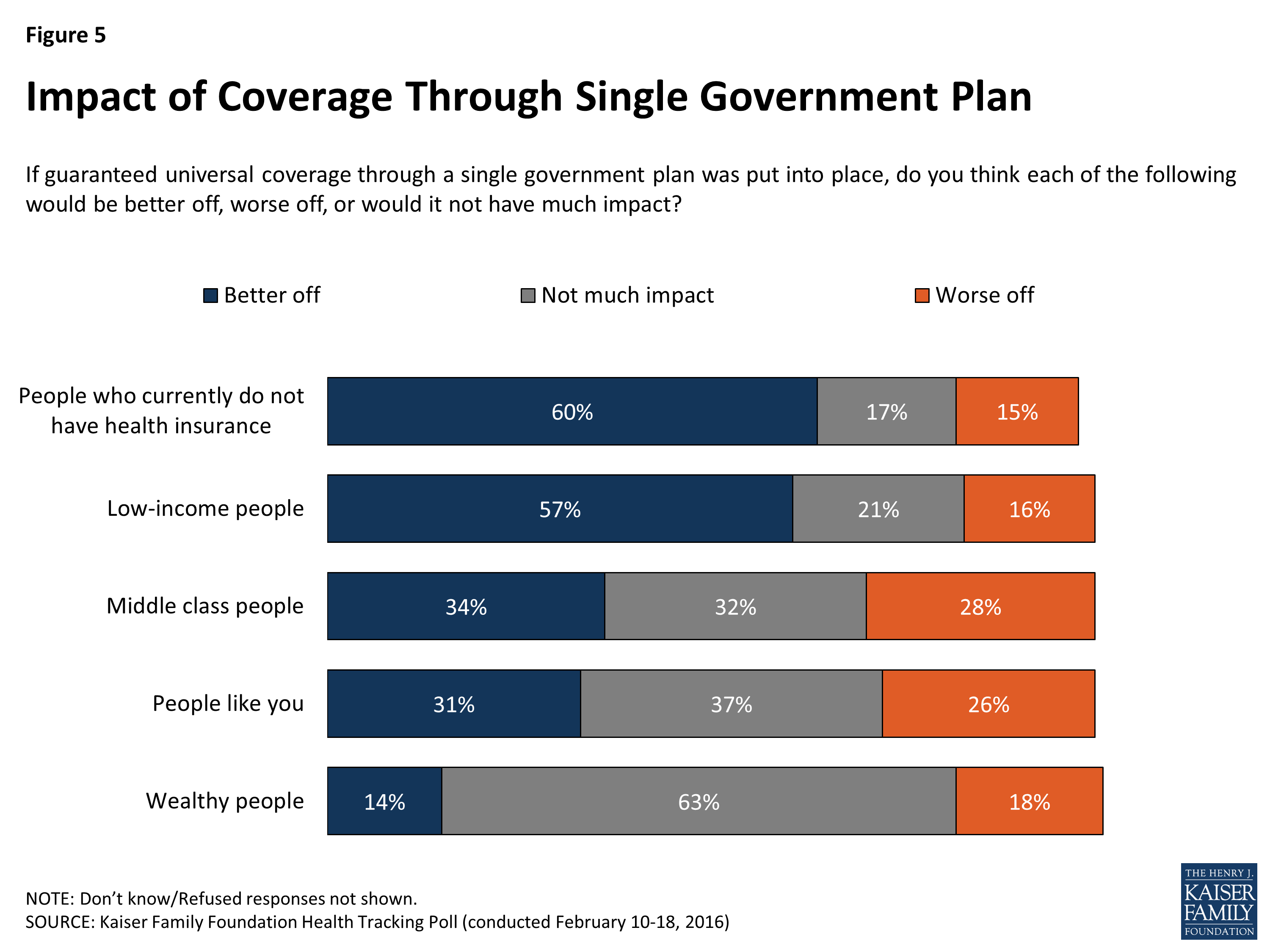Most Americans think that if guaranteed universal coverage through a single government plan was put into place, uninsured and low-income people would be better off (60 percent and 57 percent, respectively). Fewer say that middle class people (34 percent) and people like them (31 percent) would be better off, which is roughly similar to the shares who say these same groups will be worse of or not be impacted much at all. Most (63 percent) say it would not have much impact on wealthy people, just 14 percent say they would be better off and 18 percent say they would be worse off. Democrats and independents are more likely than Republicans to report that all people would be better off through a single government plan.
