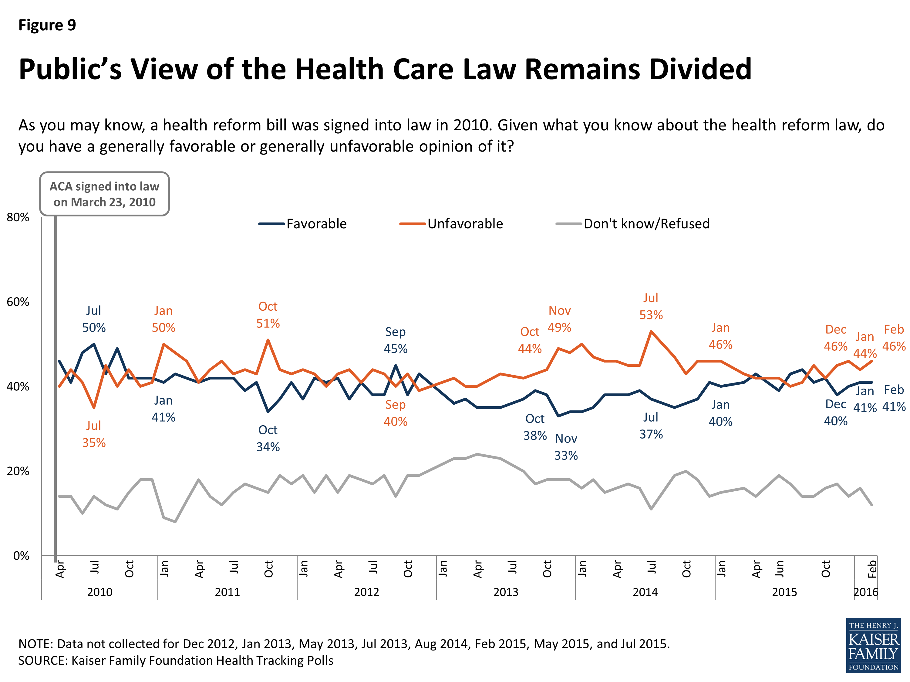 So far in 2016, opinion of the health care law itself remains largely stable, with 41 percent saying they have a favorable view and 46 percent saying they have an unfavorable view. Furthermore, partisans continue to hold widely differing views; two-thirds of Democrats (66 percent) report a favorable view, while nearly eight in 10 Republicans (78 percent) report an unfavorable view, and independents fall in the middle, tilting negative, with 38 percent saying they have a favorable opinion and 49 percent saying they have an unfavorable opinion.