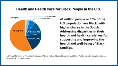Disparities in Health and Health Care Among Black People February 24, 2022 Infographic This infographic looks at the persistent disparities in health and health care for Black people, which reflect structural and systematic inequities rooted in racism and discrimination. Although disparities in health coverage for Black people narrowed after passage of the Affordable Care Act, they continue to face higher rates of illness and death compared to White people.